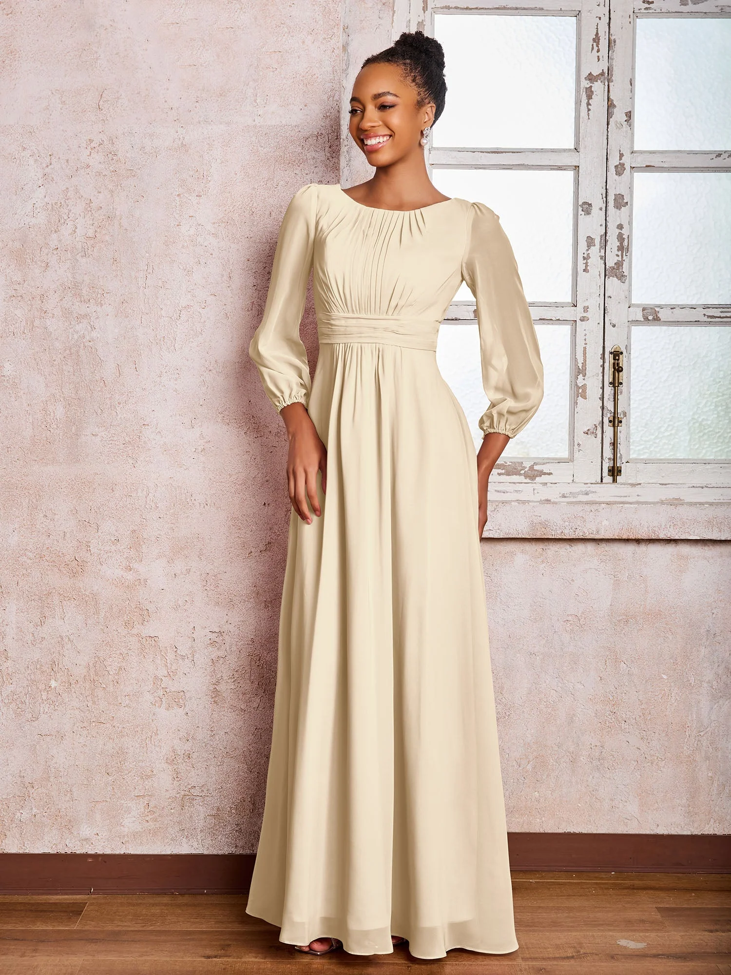 Robe Trapèze Froncée en Mousseline à Col Bateau avec Manches Longues Champagne