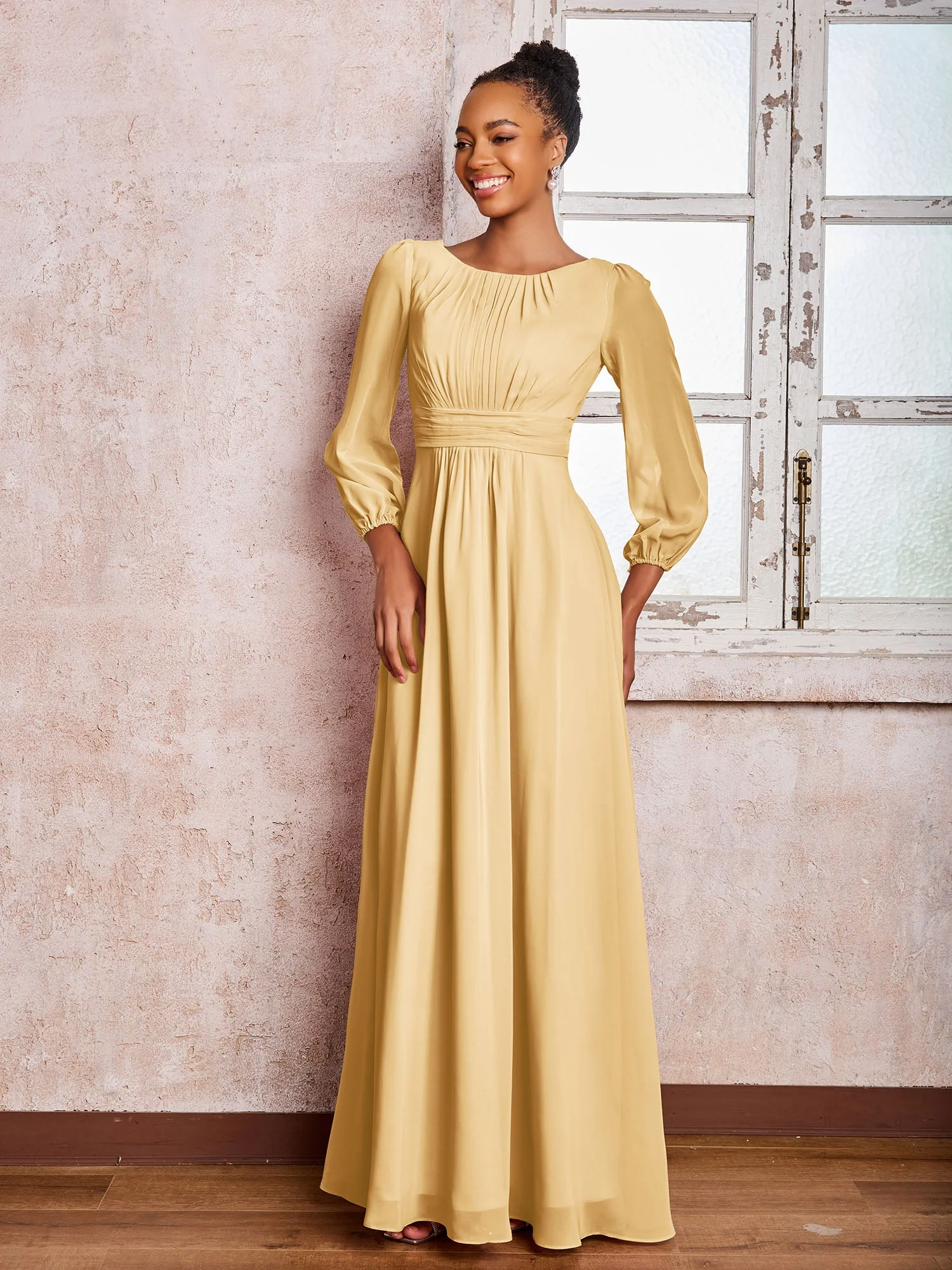 Robe Trapèze Froncée en Mousseline à Col Bateau avec Manches Longues Or